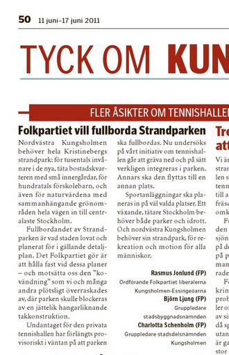 Strandparken i Kristineberg, och tennishallens framtida placering, engagerar. Det märks inte minst i lokaltidningarna. Vårt Kungsholmen har i dag en insändare av mig och Folkpartivännerna Björn Ljung och Charlotta Schenholm. Där förklarar vi varför vi står fast vid planerna för Strandparken – och att vi inte har något emot tennis, men att tennishallen behöver få en annan placering. Antingen nedgrävning eller flyttning. (Det aktuella numret finns att läsa här, insändarna är på sidan 50.) Jag infogar en bild från insändarsidan, och nedan kan du läsa hela texten.