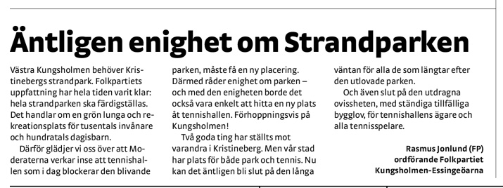 […] Vi i Folkpartiet har arbetat hårt för att hela Kristinebergs Strandpark ska anläggas. Det är också viktigt att tennishallen som i dag finns på platsen, kan få en ny permanent placering. Både parkvänner och tennisspelare behöver få besked, och löften uppfyllda av staden. Därför gläds vi nu över att Moderaterna verkar ha (åter)anslutit sig till den linje vi har hållit hela tiden. Om detta en insändare i veckans Mitt i (läs texten på Rasmus Jonlunds blogg). […]
