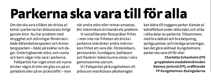 Diskussionen om trygghet och alkohol i Kungsholmens parker har vaknat till liv inför sommaren. Vi i Folkpartiet värnar människors frihet och allas möjlighet att vistas i parkerna. Om restriktivare alkoholregler behövs, är vi villiga att pröva det. Vår stadsdelsnämnds-gruppledare Charlotta Schenholm och jag skriver om det i veckans Mitt i.