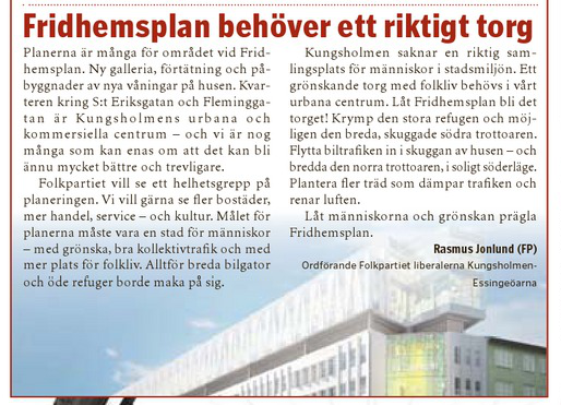 Kungsholmen fortsätter att utvecklas. Många planer finns bl.a. kring vårt ”urbana centrum” runt Fridhemsplan – S:t Eriksgatan – Fleminggatan. Folkpartiet vill se ett helhetsgrepp för utvecklingen här. Nu är det kvarteret vid Åhlénshuset som är aktuellt för omdaning. Folkpartiet har inte satt ned foten runt det specifika förslaget, men vill se det som en del av helheten. Och generellt vill vi bejaka fler bostäder, större utbud av service, handel, kultur och nöjen, mer människor och folkliv – och större plats för detta folkliv! I senaste Vårt Kungsholmen skriver jag om vår tidigare framförda idé om att vi behöver en riktig samlingsplats i form av ett centralt beläget torg på Kungsholmen – gärna grönskande, och gärna på Fridhemsplan. Se insändaren avfotad ur lokaltidningen nedan (det aktuella numret av Vårt Kungsholmen finns att läsa på webben här), och läs den i klartext därunder.
