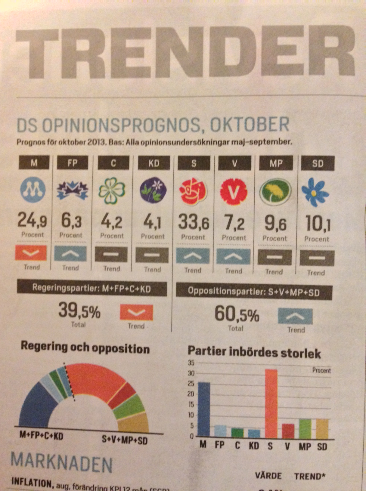 Svagt väljarstöd och två partier på gränsen till riksdagen. Lägre tilltro i flera av de viktiga sakfrågorna (DN). Sjunkande förtroende för den länge så överlägset populäre statsministern.