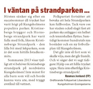 Kungsholmen behöver Kristinebergs Strandpark. Folkpartiet fortsätter kämpa för att hela parken ska anläggas – och i senaste Vårt Kungsholmen ber jag Kungsholmsborna hjälpa oss att hålla trycket uppe.