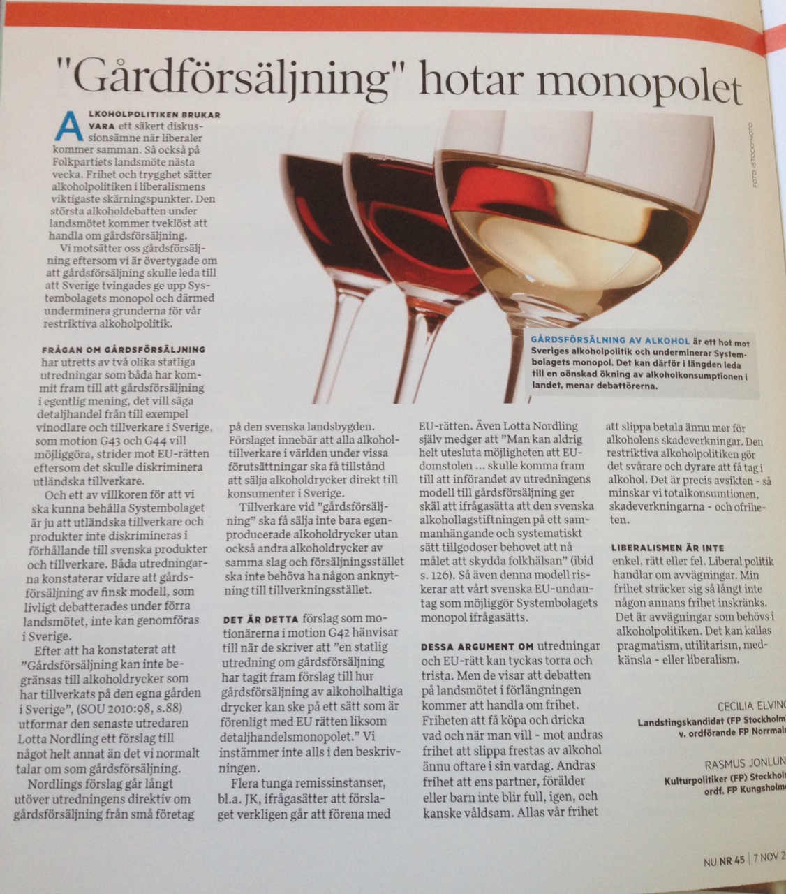 Jag skrev tidigare i höstas om min personliga syn på alkoholpolitiken. Den specifika sakfrågan den här gången gäller gårdsförsäljning – en något missvisande beteckning på vad de aktuella förslagen handlar om. I veckans nummer av det liberala nyhetsmagasinet NU, som är ett medlemsnummer som når alla medlemmar i Folkpartiet, skriver jag tillsammans med Cecilia Elving om varför socialt medvetna liberaler bör rösta nej till förslaget om s.k. gårdsförsäljning.