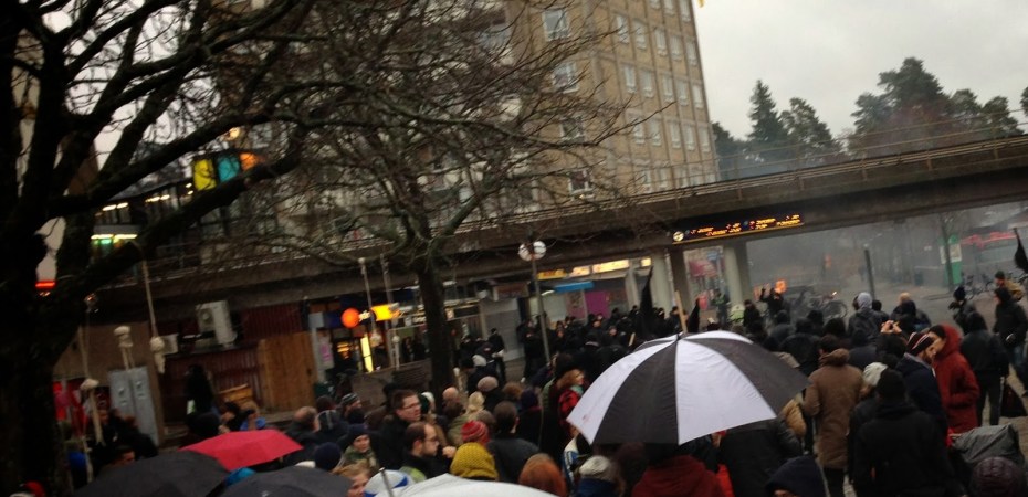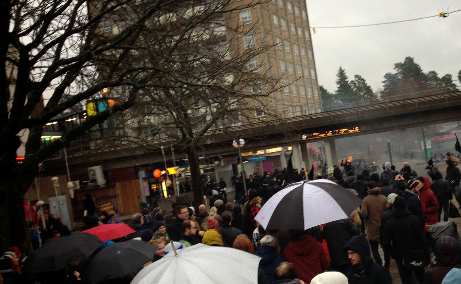 Min vän och kollega Jesper Svensson var på plats i Kärrtorp i går och vittnar på sin blogg om det som hände när den antirasistiska demonstrationen angreps av nynazister. Det är hans foto jag har lånat ovan.