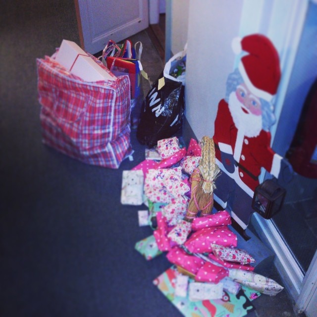 För några av de sistnämnda gjordes en fin insats av goda, hjärtevarma vänner häromdagen: En fråga från en vän på Facebook som delades gav upphov till flera kassar julklappar till gömda flyktingbarn och deras familjer. Själv hade jag inte några överblivna leksaker att bidra med, och jag brukar vara rätt duktig på att fort skänka bort det som går till Myrorna eller Stadsmissionen, men jag kunde åtminstone hjälpa till att dela appellen och vara sambandscentral för en del av gåvorna – se bilden ovan till höger. I går hämtades de och fördes vidare till Läkare i världen och andra organisationer som hjälper flyktingar och andra behövande, som inte har någonstans att fira jul och ingen som ger dem julklappar. (Läs mer på Stockholmsbloggen.)