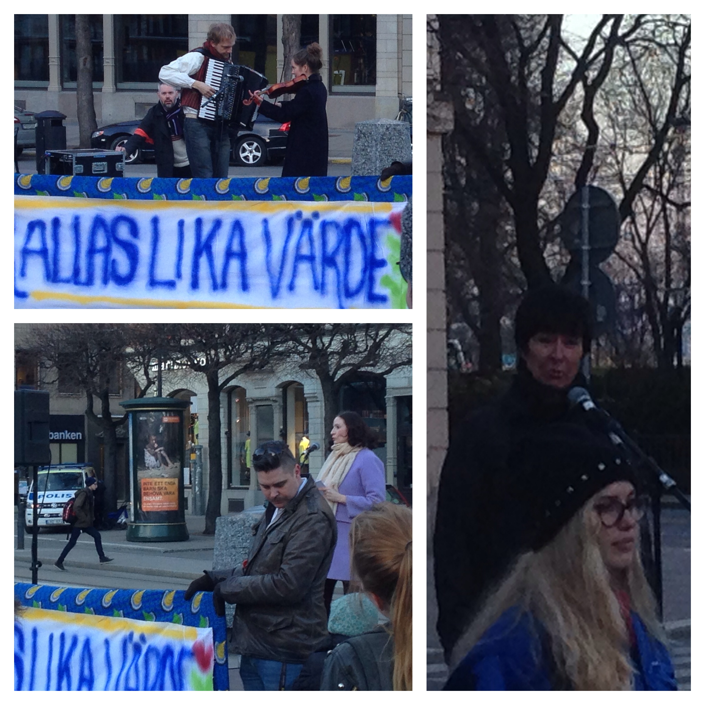 En kylslagen söndageftermiddag då vintern åter gjort sig påmind i Stockholm är det inte ett självklart val att ställa sig på det blåsiga Norrmalmstorg för att lyssna på talare och folkmusik. Ändå var det vad ganska många stockholmare valde att göra med relativt kort varsel i dag. Det var en partipolitiskt obunden manifestation anordnad av ledarskribenten m m Sakine Madon, som ville markera mot rasismen – och även visa att liberaler visst gärna inte bara argumenterar utan också demonstrerar mot mörkerkrafterna (något som ju ifrågasatts bl a av Nabila Abdul Fattah i Etc; Sakine Madon skrev själv i går i Expressen). Vi lyssnade till demokratiminister Birgitta Ohlsson, RFSL:s tidigare ordförande Sören Juvas, författaren och skaparen av Berättarministeriet Dilsa Demirbag-Sten och förra S-ledaren och mångåriga ministern m m Mona Sahlin – samt till dragspels- och fiolmusik framförd av folkmusiker mot rasism.