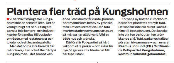 Därför slår Folkpartiet så hårt vakt om våra parker – och slåss för nya. Vi ger oss inte förrän det blir fler träd i stan!