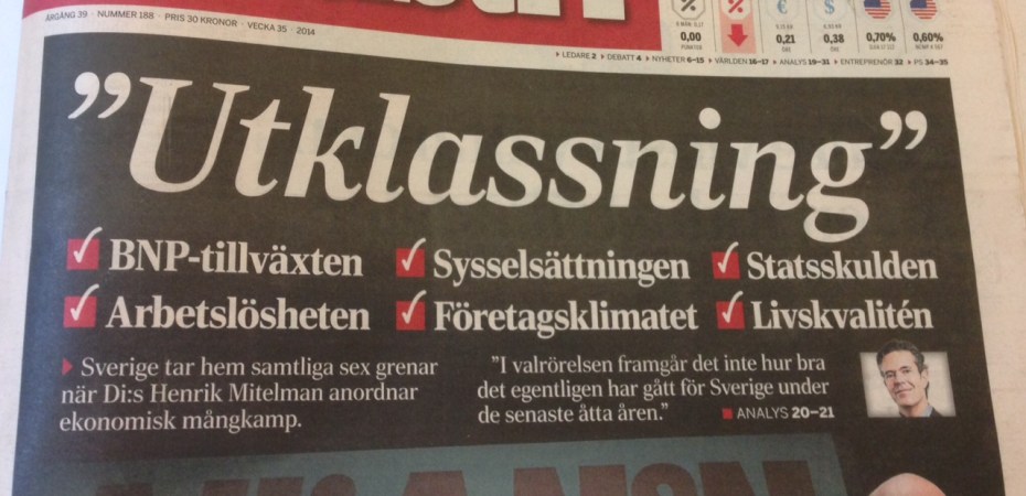 Rosa affärstidningar är inte min högst prioriterade läsning men budskapet i dag är något som många fler än DI:s regelbundna läsare behöver få ta del av: ”Utklassning”. Vår tillväxt, vår ”unika” ökning av sysselsättningen, vår relativt sett positiva arbetslöshetsstatistik är bara tre av grenarna. Arbetslösheten ska dessutom ses i perspektivet att arbetskraften har ökat kraftigt; i flera av våra grannländer är utvecklingen motsatt, till skillnad från i Sverige har många gett upp hoppet. I Sverige finns det all anledning att vara hoppfull, med över 250 000 nya jobb sedan 2006, varav 180 000 har fyllts av utlandsfödda, och där unga och nu även långtidsarbetslösa känner av den minskande arbetslösheten.