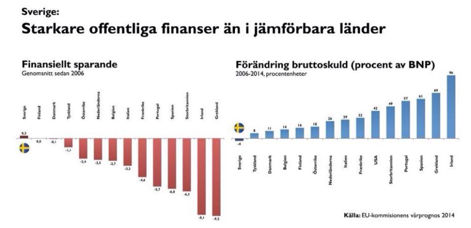 För att svartmålningen ska fungera krävs helt enkelt att man bortser från ekonomiska realiteter. Förutom den starka arbetsmarknaden, med 300 000 fler jobb mellan 2006 och 2014, står sig statsfinanserna mycket starka, både ur ett historiskt och ur ett internationellt perspektiv som framgår av bilden ovan, över finansiellt sparande och förändring av bruttoskulden som andel av BNP i europeiska länder.
