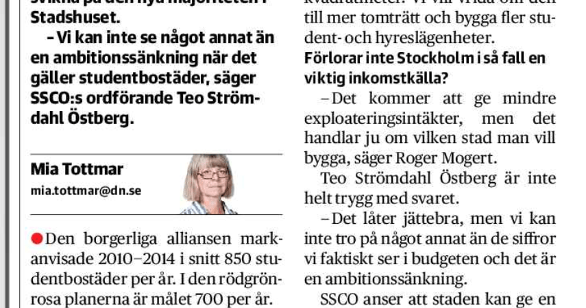 Studentbostäderna kommer dock inte bli fler för att ambitionerna sänks. Stockholms studenter reagerar med all rätt mot den nya rödgrönrosa Stadshusmajoritetens nedskärning av årsmålet från 850 till 700 markanvisningar (se dagens DN, ej på nätet men artikel ovan). Majoriteten lovar att man ändå ska se till att fler bostäder blir byggda – men den som granskar de rödgrönrosas planer för bostadsbyggande i stort, och deras agerande de senaste oron, har all anledning att misstro det löftet.