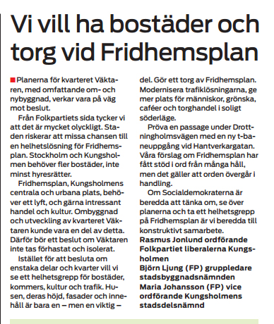 […] Folkpartiets förslag om en helhetslösning för Fridhemsplan är åter aktuell. Planerna för kvarteret Väktaren med bostäder och galleria ligger på is. I Mitt i Kungsholmen skriver Rasmus Jonlund, Maria Johansson och Björn Ljung om att vi vill se över byggplanerna och samtidigt förverkliga vår idé om ett grönskande torg med folkliv och serveringar. Se nedan eller läs mer på Rasmus Jonlunds blogg. […]