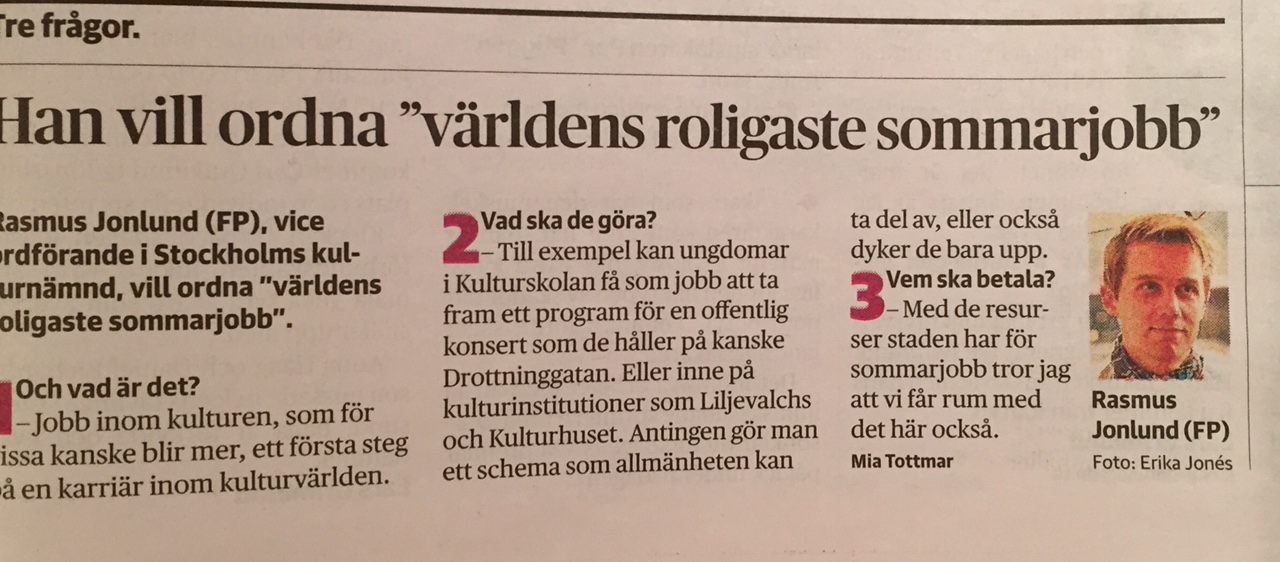 Fler unga ska få chansen till ett sommarjobb. De kommunala feriejobben har därför utökats kraftigt i Stockholm de senaste åren. Folkpartiet vill införa ett nytt inslag: sommarjobb inom kulturen, på någon av stadens kulturinstitutioner.