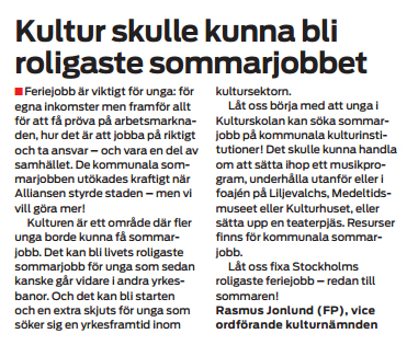 […] Sommarjobb är viktiga för ungdomar. Kommunala feriearbeten anordnas för att ge alla Stockholms unga en chans att pröva på arbetsmarknaden. Folkpartiet föreslår ett nytt område för kommunala sommarjobb: i kulturen! Det kunde bli stans roligaste sommarjobb. En skrivelse har lagts i kulturnämnden av bland andra Kungsholmsliberalen och vice ordförande Rasmus Jonlund. Se insändare i Mitt i nedan – läs mer om de roligaste sommarjobben på Rasmus Jonlunds blogg. […]