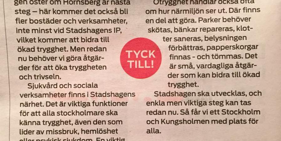 1. […] Stadshagen  ska vara och upplevas lika tryggt som resten av Kungsholmen. Enligt Folkpartiet handlar det om allt från bättre städning och belysning i parker och på gångstråk, till kunskap, dialog och konstruktiva lösningar om sociala verksamheter som sprutbytet. Om det skriver tre Kungsholmsliberaler (Maria Johansson, Magnus Liljegren och Rasmus Jonlund) i veckans lokaltidning Mitt i. Se bild nedan. Läs hela texten på Rasmus Jonlunds blogg. […]