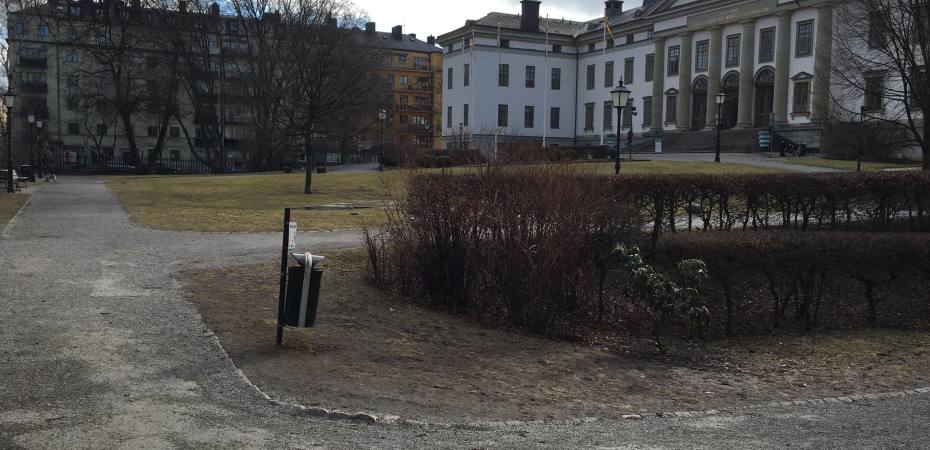 Landstingshusets tomt är inte en offentlig park som staden kontrollerar på samma sätt som andra parker. Den är likväl öppen för allmänheten, och utnyttjas inte minst av många barn från olika förskolor med trånga eller obefintliga egna gårdar. Här finns grönska och planteringar, men också mycket asfalt. Mer borde kunna göras i en positiv dialog mellan staden och landstinget, tycker vi.