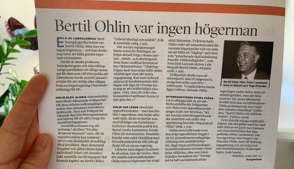 Var hör liberalerna hemma i dagens föränderliga partipolitiska landskap? Vad skulle en liberal legendar ha sagt om januariavtalet? Att göra den mångårige Folkparti-ledaren Bertil Ohlin (1899-1977) till postumt språkrör för dem som föredrar att Liberalerna väljer samverkan högerut, med stöd av SD, leder fel. Det skriver jag i en artikel i det liberala nyhetsmagasinet NU. Se bild nedan – hela texten under bilden.